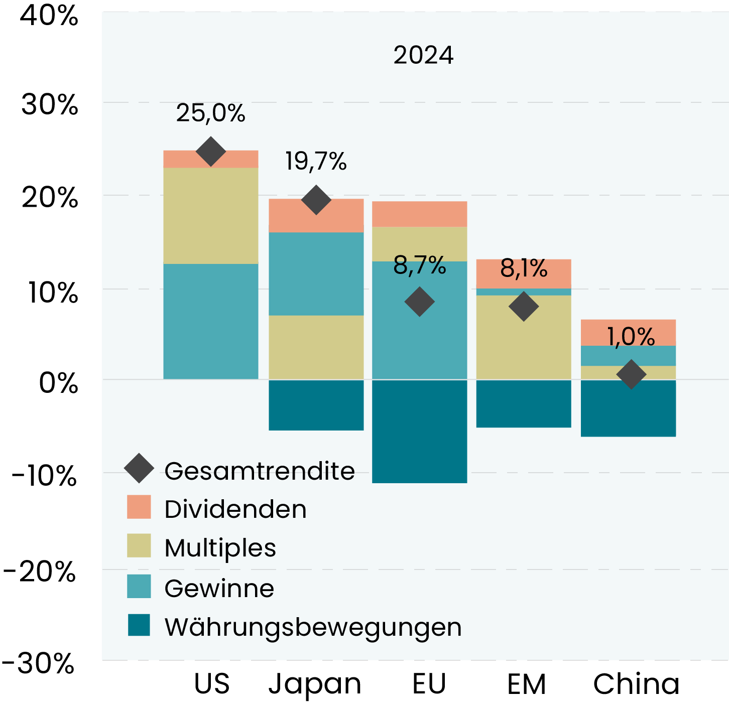 Die folgende Grafik zeigt, wie diese Treiber über 15 Jahre zu den Gesamtrenditen verschiedener Regionen beigetragen haben: