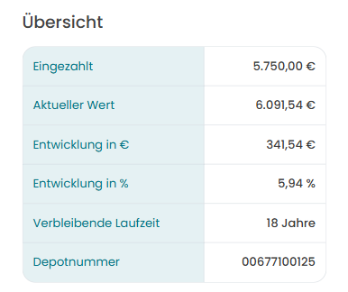 Im Portal sehe ich auf einen Blick, was das Ziel ist, wie viel schon investiert wurde, wie sich meine Investments bisher entwickelt haben und eine Szenarienrechnug wie es sich in Zukunft entwickeln könnte.