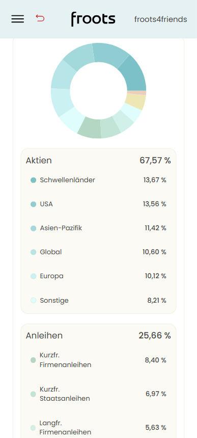 In der Detailansicht der Portfolioallokation sehe ich die Aufteilung der Anlagen – nach Regionen, Anlageklassen und Produkten.