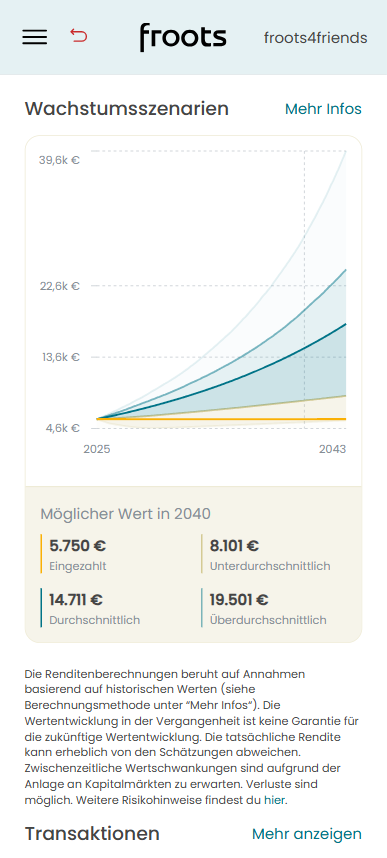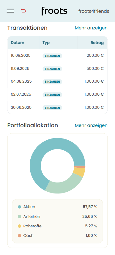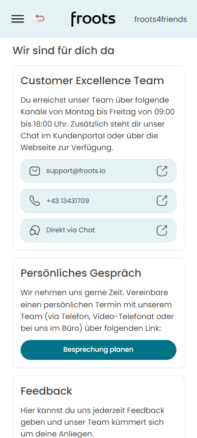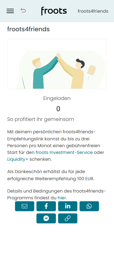 Im Kundenportal gibt es auch einen Bereich für unser froots4friends-Programm. Kund:innen, die froots weiterempfehlen, bekommen 100 Euro als Dankeschön.