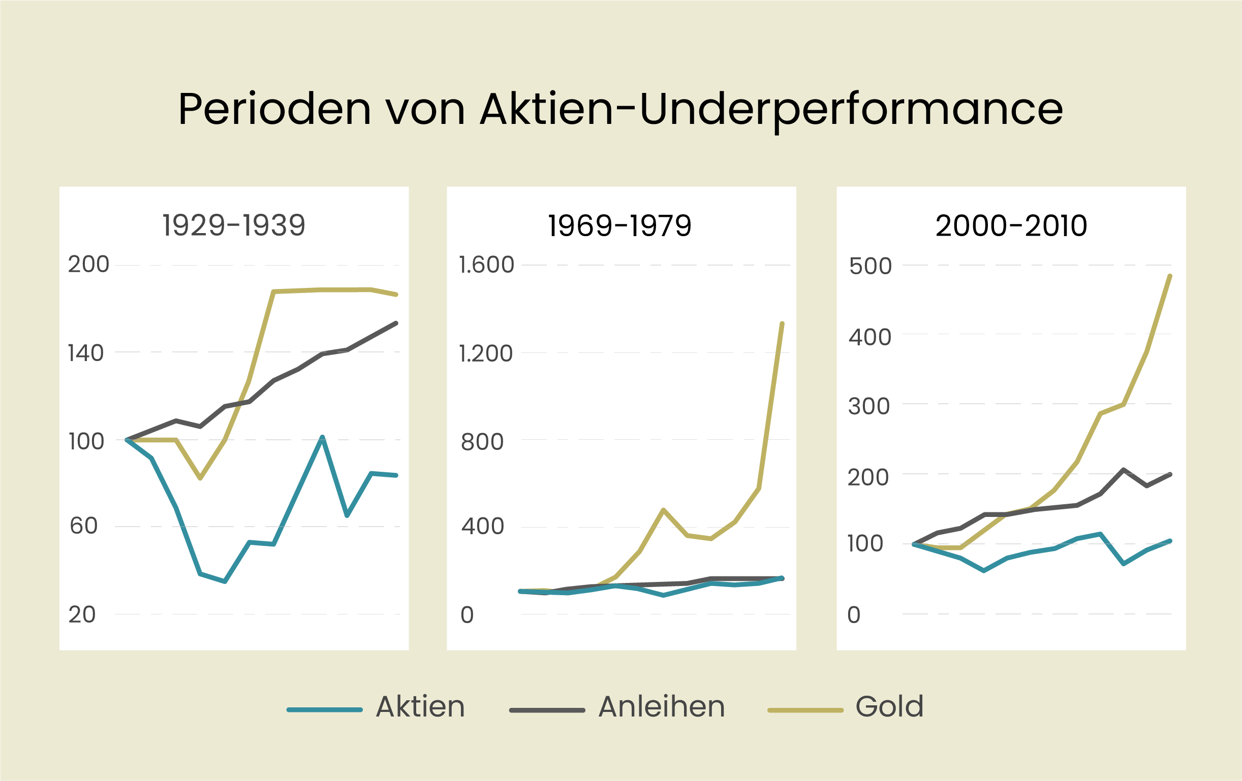 Ein Blick auf die letzten 100 Jahre zeigt jedoch ein anderes Bild: In drei von zehn Jahrzehnten schnitten Aktien schlechter ab als andere, weniger volatile Anlageklassen.