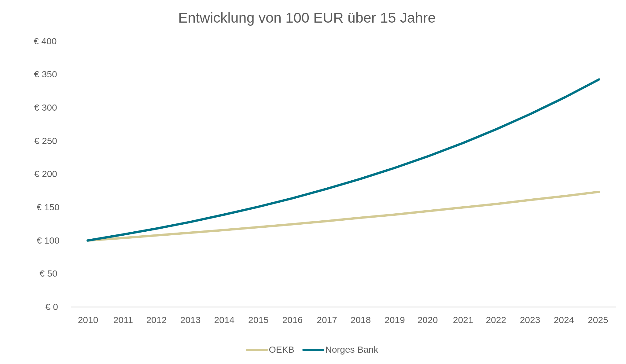 Die Erträge des norwegischen Fonds sind kein Zufall, sondern das Ergebnis eines strukturierten, disziplinierten Ansatzes. Ein Blick auf die Entwicklung eines Investments von 100 Euro über 15 Jahre zeigt: Trotz Schwankungen hat sich das Kapital signifikant vermehrt.
