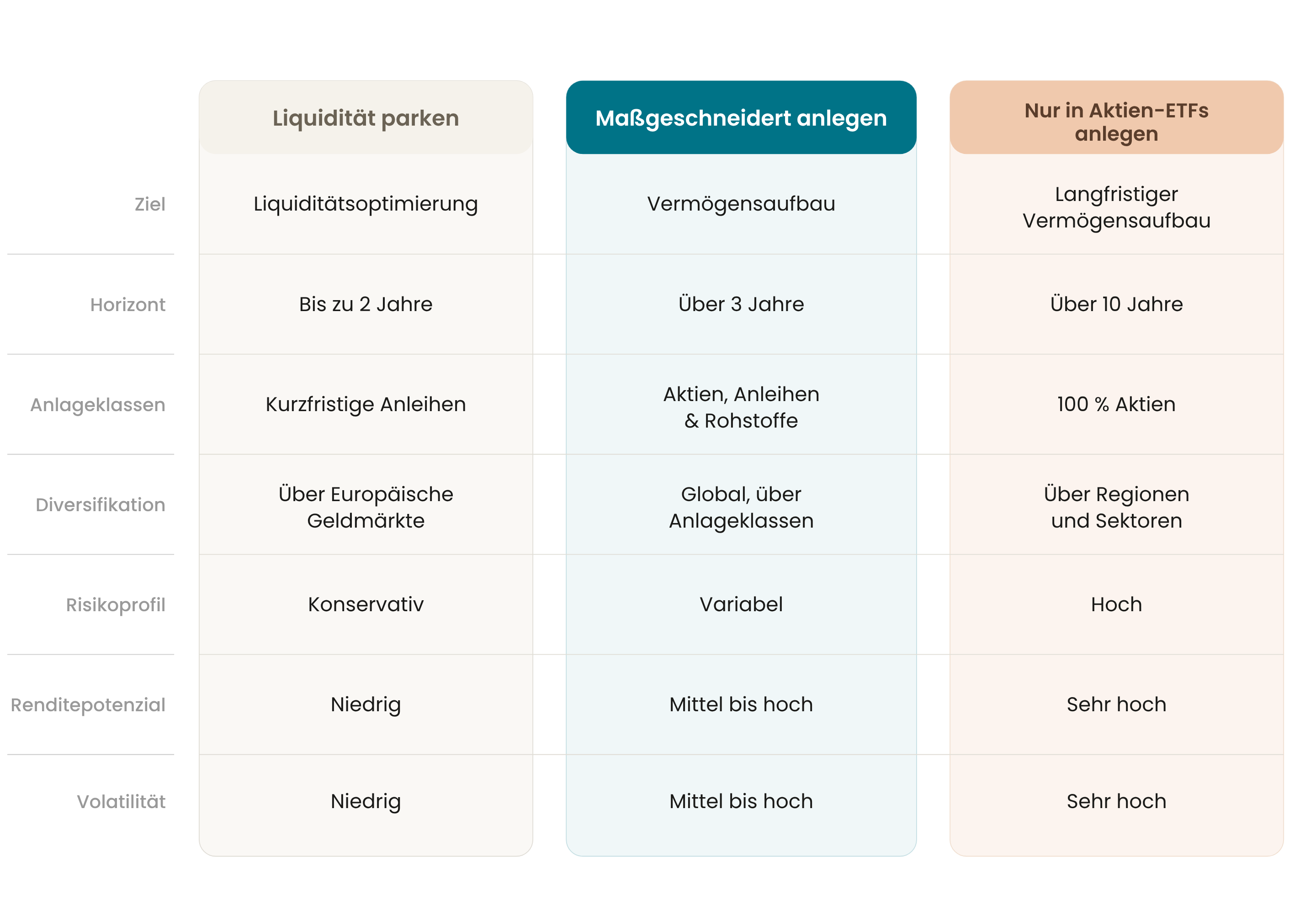 Wie du merkst: Es ist erklärungsbedürftig, aber gar nicht so kompliziert. Für alle, die ein besseres Gefühl für die Unterschiede bekommen möchten, haben wir die drei Lösungen hier einmal gegenübergestellt. Du siehst: Es geht immer um das Verhältnis von Zeit, Risiko und Renditepotenzial.